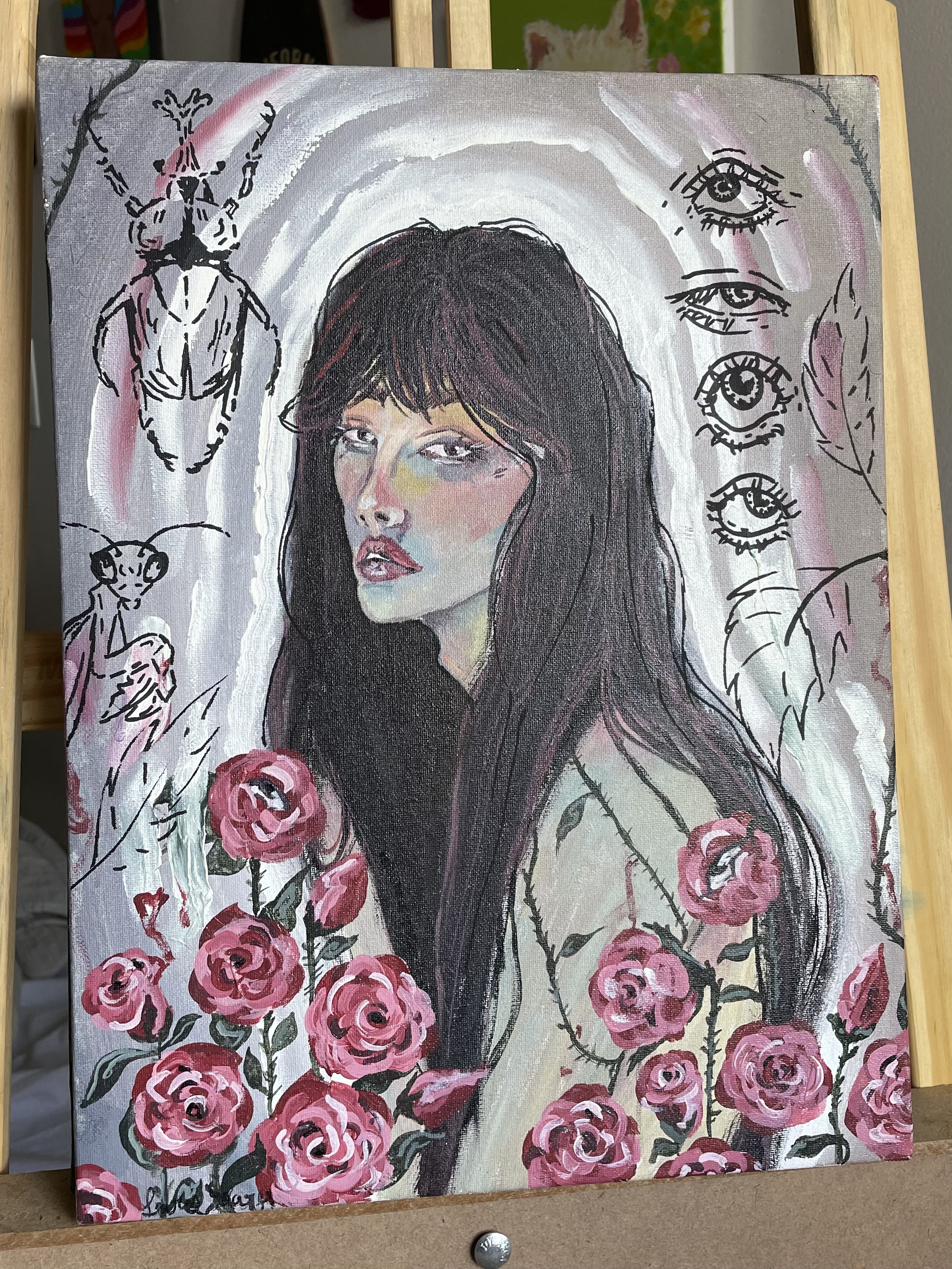 DisponívelObra autoral única. Técnica mista: Acrílica sobre tela e detalhes em caneta POSCA. Dimensões: 30x40cm. Uma composição que explora a dualidade entre o olhar, a natureza e elementos gráficos.